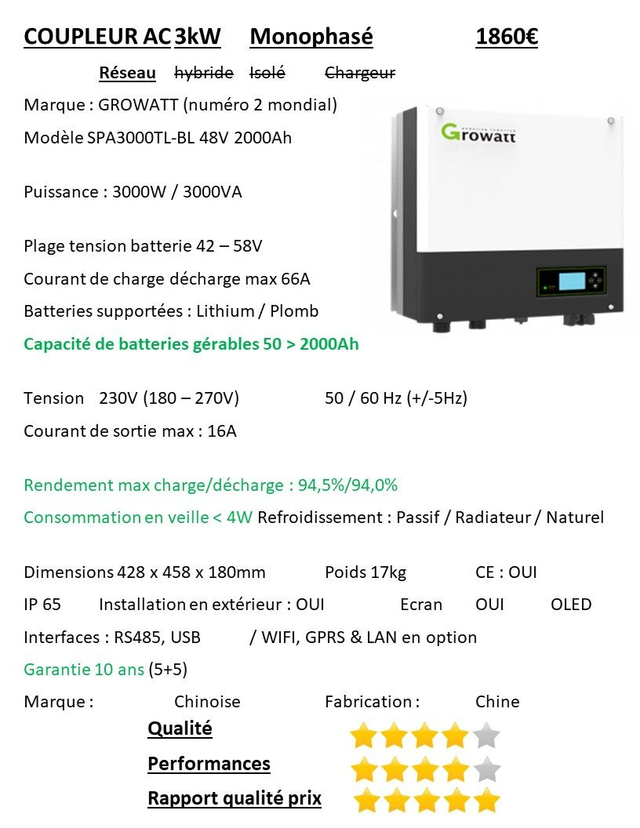 1 Onduleur 3kWc & 1 Coupleur AC 3kW 48V Growatt
